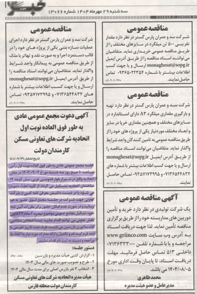 آگهی دعوت مجمع عمومی عادی به طور فوق العاده نوبت اول اتحادیه شرکت های تعاونی مسکن کارمندان دولت