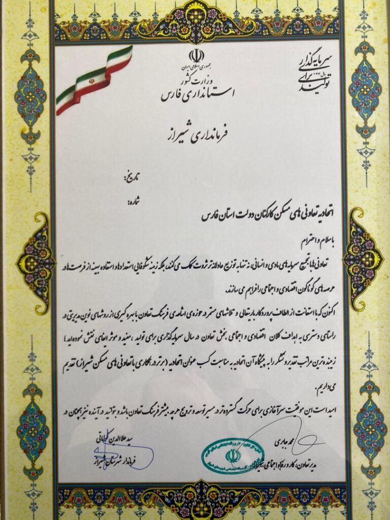 انتخاب اتحادیه تعاونی مسکن کارمندان دولت فارس به عنوان اتحادیه برتر